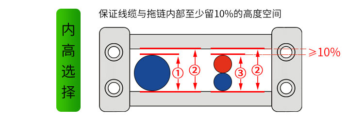 (拖鏈內(nèi)高②)≥(線纜直徑①)*10%,若重疊按(重疊后實際高度③)作為線纜直徑