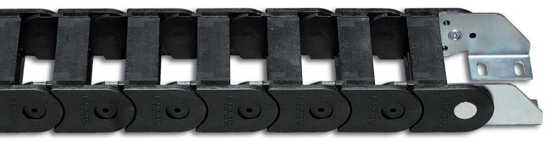 尼龍拖鏈端部連接頭端部連接頭裝置允許拖鏈的兩端都與設備相連。 端部連接頭的電纜夾和行程中點的限位器可以根據需要提供。